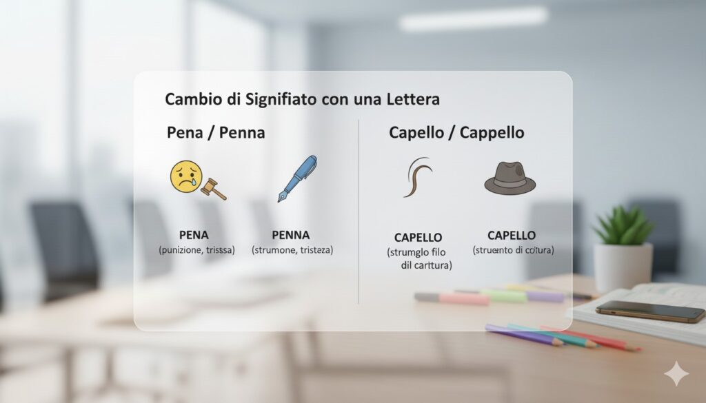 Vediamo allora una lista di parole che cambiano significato con una sola lettera, con esempi pratici e trucchi per non sbagliarle più.
